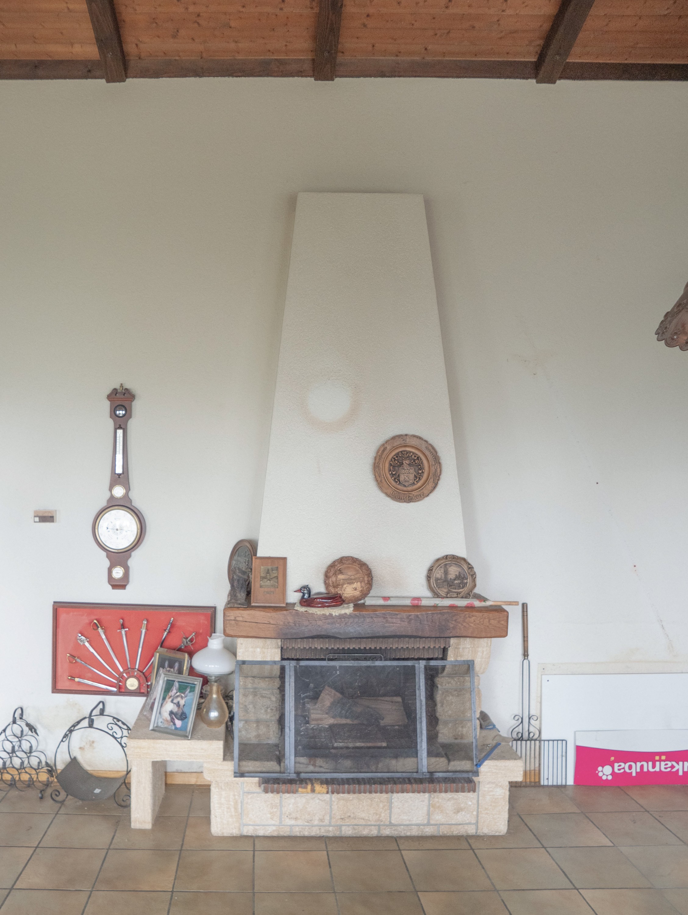La palette de matériaux repose sur des matières naturelles et pérennes. Les plafonds en bois existants sont conservés et repeints, dialoguant avec des menuiseries en frêne massif et en chêne qui soulignent les nouvelles interventions au sein de la maison. Les murs sont traités à l’enduit à la chaux, tandis que la cheminée, redessinée en brique de terre crue, retrouve un rôle structurant au cœur de l’espace de vie.