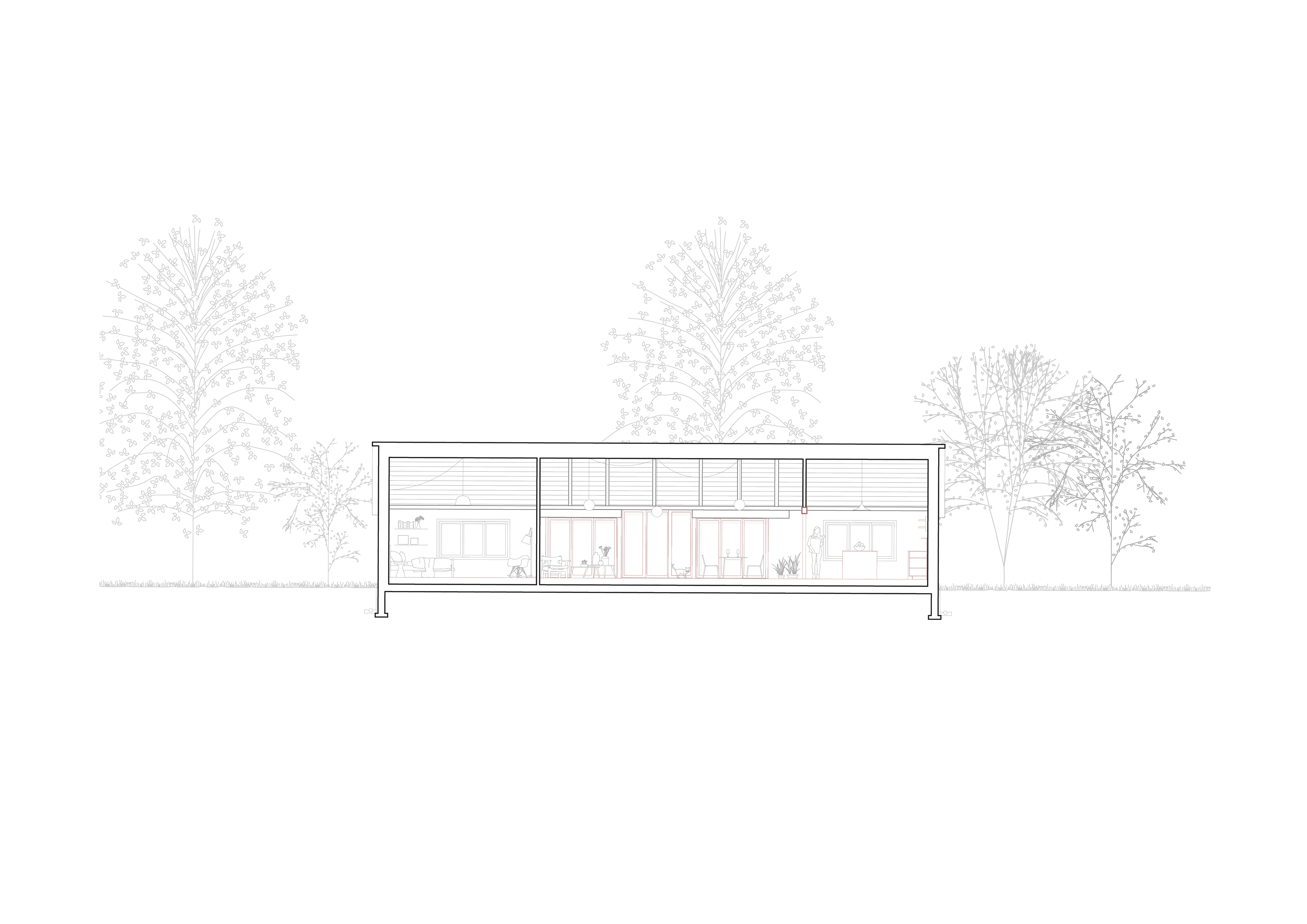 Ouverte sur le séjour, la cuisine participe à la constitution d’un espace commun, propice aux usages partagés et aux interactions quotidiennes. L’agrandissement des ouvertures du séjour renforce ce sentiment de continuité spatiale entre l’espace de vie et l’extérieur, faisant de la lumière et du paysage de véritables composantes actives du projet. L’agencement de la salle de bain est conçu selon une gradation d’intimité, adaptée à la diversité des usages et des temporalités.